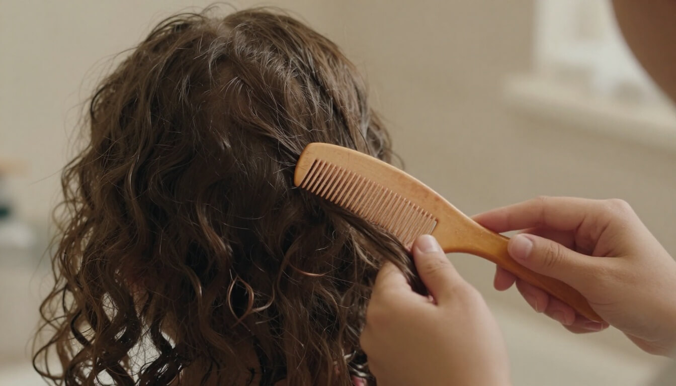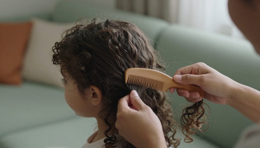 - Utilise un peigne dents larges ou tes doigts, jamais une brosse classique. Les picots rigides accrochent les boucles et les cassent net. Avec un peigne adapté, la technique démêlage enfant devient fluide et sans arrachage.