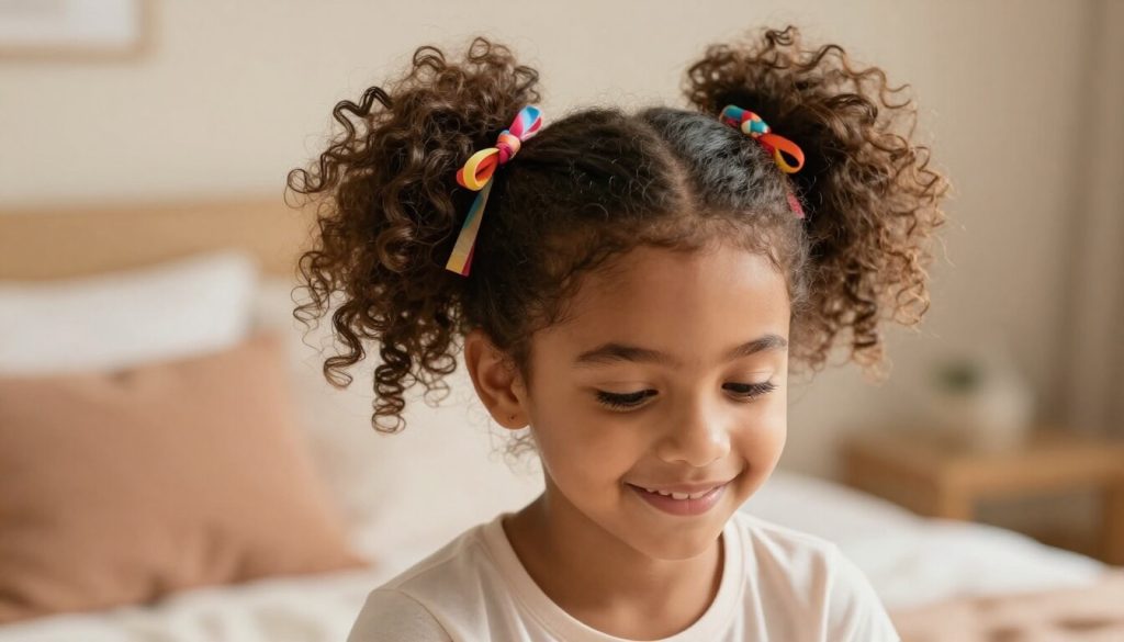 - Les couettes hautes (ou doubles couettes) — 5 minutes chrono. C’est la valeur sûre pour une coiffure fille cheveux bouclés facile. Tu rassembles les boucles en deux pompons symétriques, et elles tiennent impeccablement toute la journée. Finis avec un nœud ou un ruban coloré : ta fille va adorer choisir la couleur.